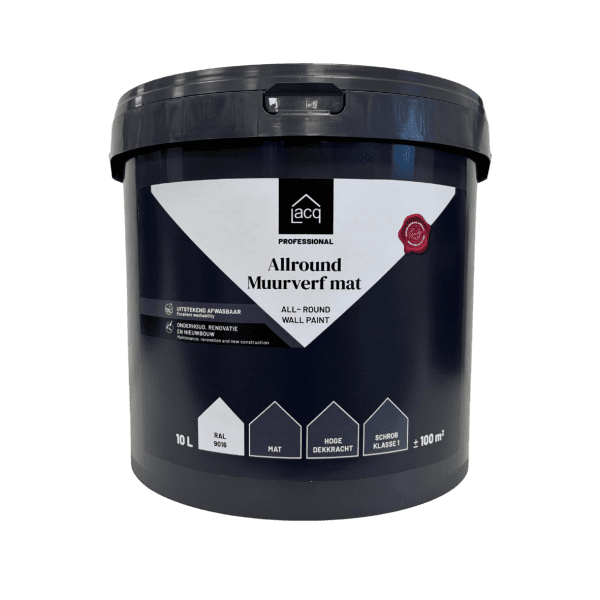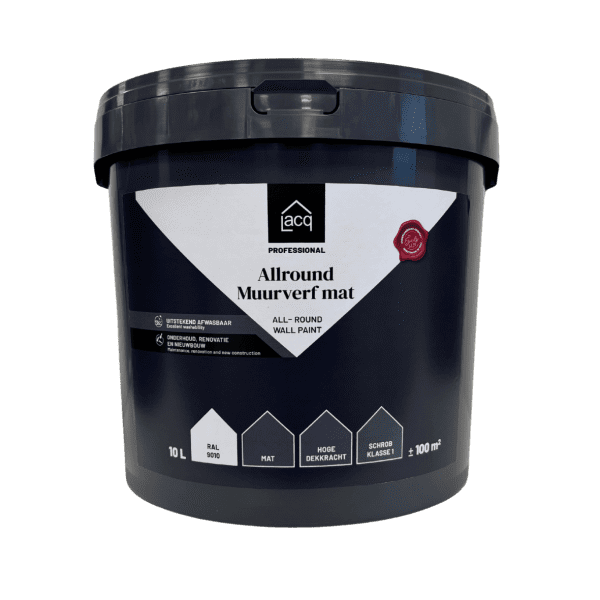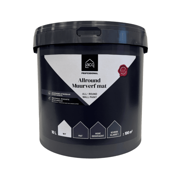 Lacq Allround Muurverf Mat is een allround muurverf voor binnen op waterbasis met een matte afwerking. Uitstekend geschikt voor renovatie en nieuwbouw voor de afwerking van plafond, metsel- en pleisterwerk, beton, gasbeton, gipselementen, etc. Deze muurverf is aanzetvrij en zeer goed afwasbaar door zijn schrobklasse 1.